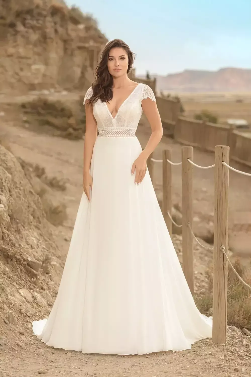 Résolument bohème, la collection Bo’m 2025 séduit les mariées qui rêvent de naturel et d’authenticité. Les matières fluides, les dentelles végétales et les coupes aériennes offrent un look à la fois romantique et moderne.